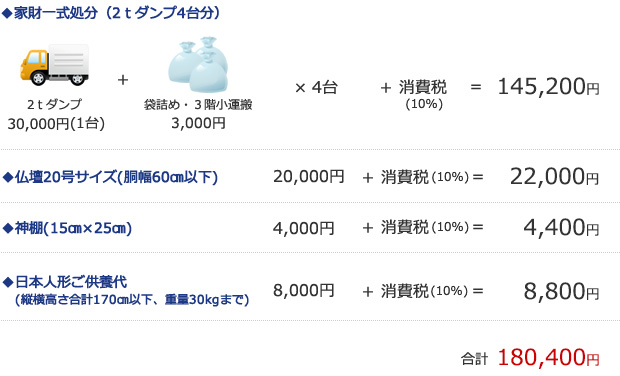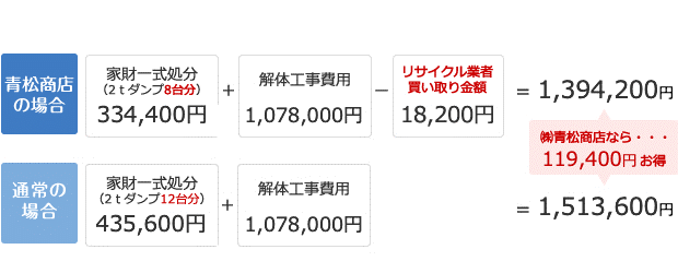 家財の処分の台数が2tダンプで12台分。このうち2台分をリサイクル業者に使える家財を買い取っていただきました。話を進めていくうちにこの家の解体工事もさせていただきました。解体工事は家財のタンスなどの木製品も重機で運べるため2台分家財運搬が減り、当初の家財の2tダンプ12台分が8台分に減りました。